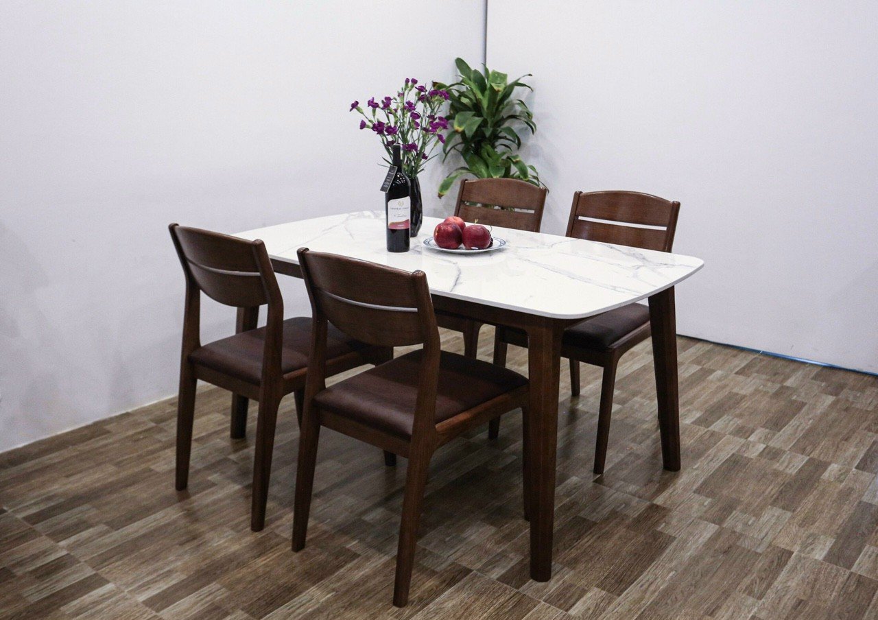 Minh Thịnh Giới Thiệu Bộ Bàn Ăn 4 Ghế Gỗ Sồi Tự Nhiên Pha Màu Óc Chó Với Thiết Kế Sang Trọng Và Chắn Chắn Bàn Đã Pha Màu Óc Chó Hoặc Màu Hương Tùy Theo Nhu Cầu Của Khách Hàng Ưu điểm đặc biệt của bàn ăn mặt đá có khả năng chịu lực, nhiệt cao. Do đó tuổi thọ sản phẩm được tăng lên